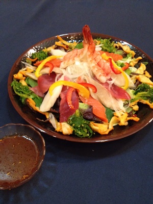 Chirashi Sushi served over greens, seaweed salad and squid salad