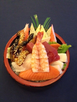An assortment of raw and cooked fish arranged carefully over a bed of rice.
